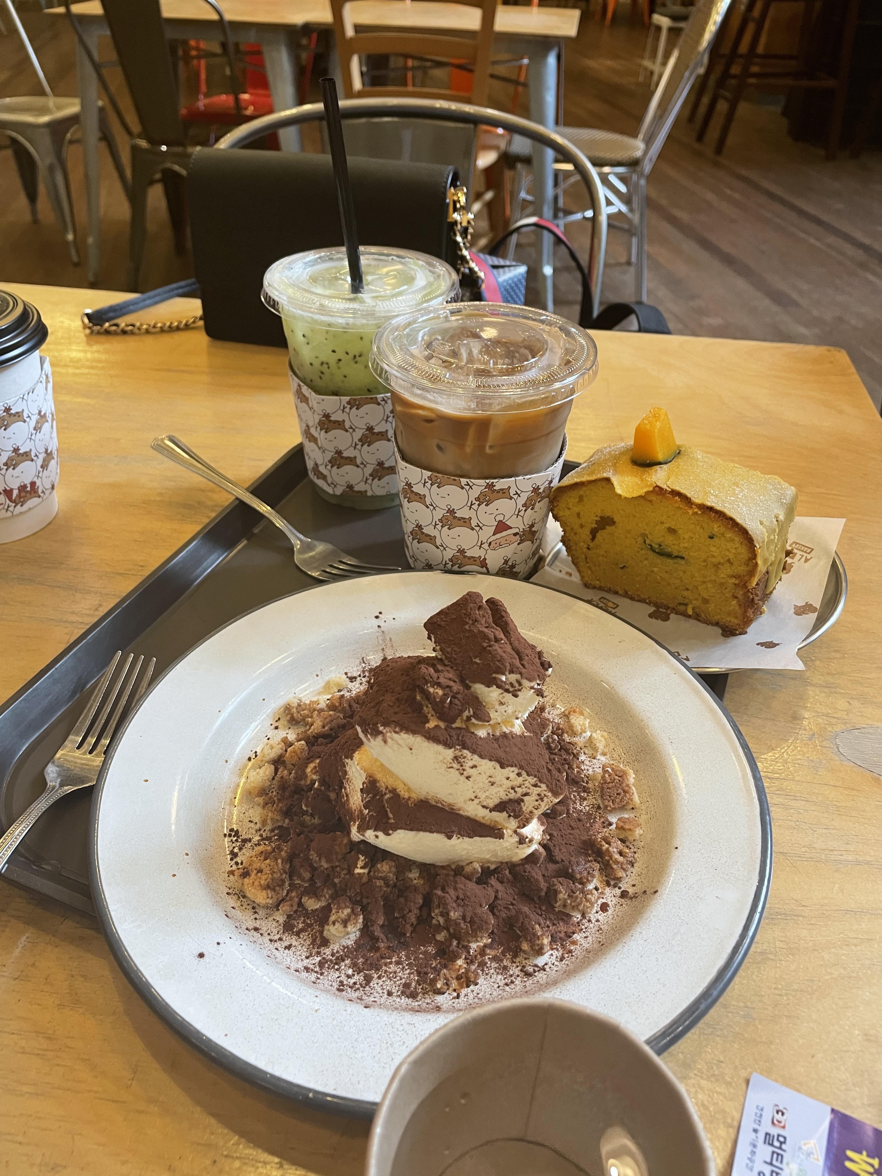 나의 최애이자, 이 카페에서 가장 유명한 베이커리는 티라미슈!! 티라미슈케잌은 다른 곳에서 자주 접할 수 있는 커피에 담궈진 빵사이에 크림이 있는 그런 평범한 케잌이 아니고, 신기하게 빵부분이 하나도 없는 그런 케잌이다. 코코아가루 듬뿍 + 소보로 윗부분 같은 빵 부스러기? 가 함께 있어서 부드러운 크림과 너무 잘어울린다. 자주 생각나는 티라미슈,, 어떻게 만드는지 진짜 궁금하니깐 누가 알려주라줘....