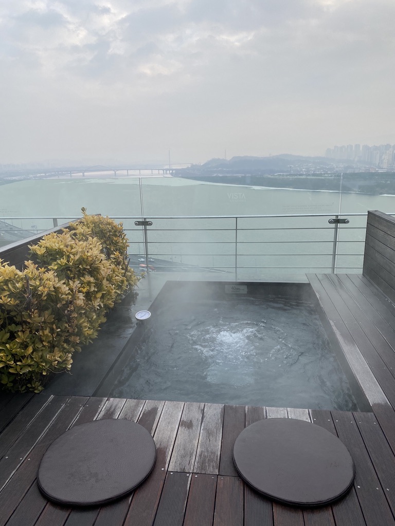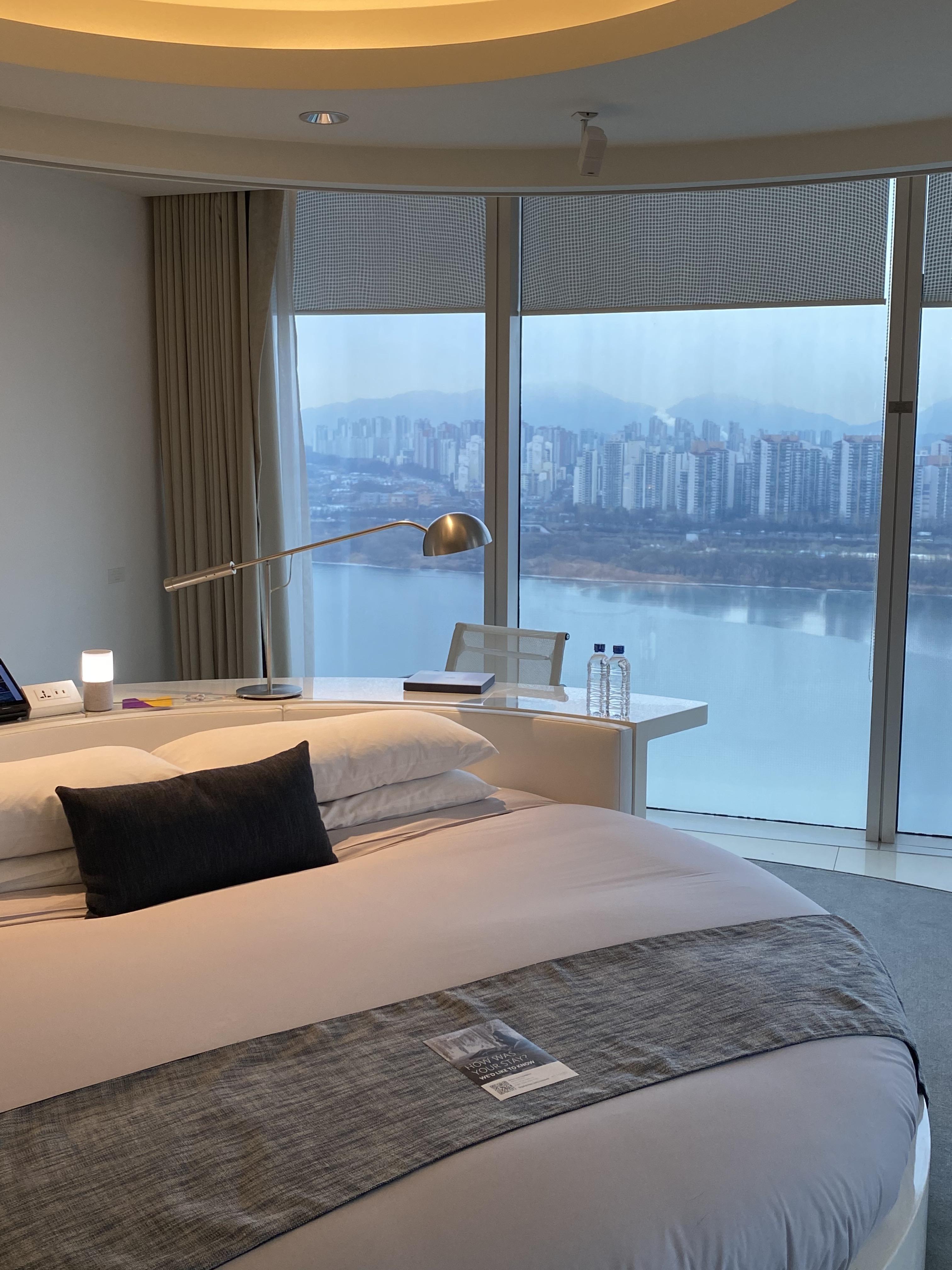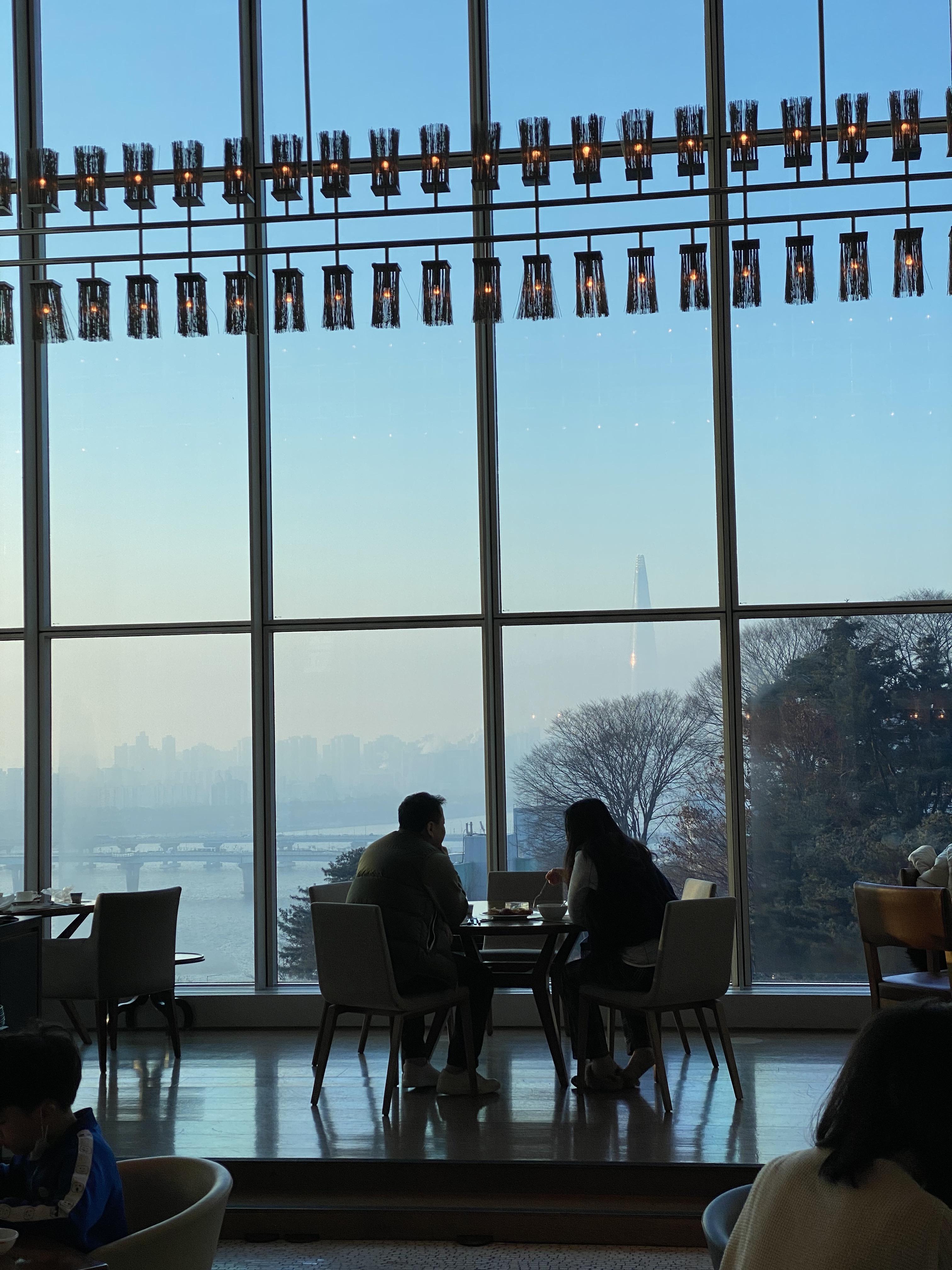 확실히 통유리로 즐기는 일몰과 일출은 사람을 기분 좋게할 정도였다. 특히 오른쪽 통유리로는 롯데타워가 보이는데 도시빛이 가득해서 밤이 볼만했다.