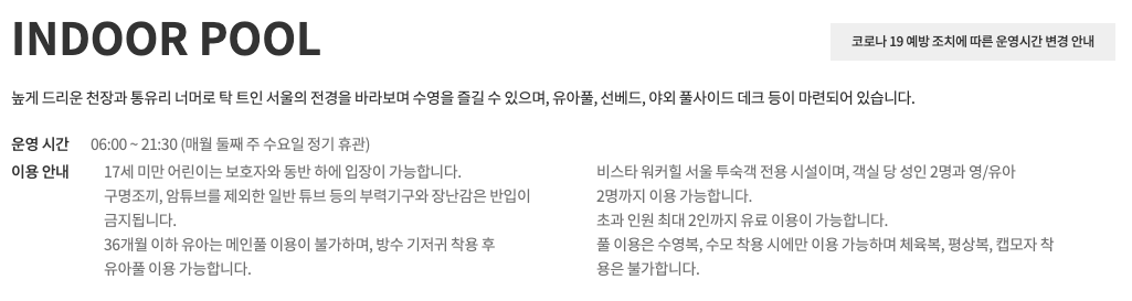 꼭 가봐야하는 두 번째 공간은 수영장이다. 방문할 때가 겨울이기 때문에 여름 한정 운영하는 outdoor pool은 아직 열리지 않았을 때이다. 이용을 하기위해서 수모는 필수이고 현장에서 5천원으로 구매할 수 있다. 사용 안내사항에 적혀있듯이 객실당 성인의 경우 2명까지 무료 이용이 가능하고 추가 인원에 대한 추가 요금이 발생한다. 근데 침대를 추가했을 경우는 무료로 이용할 수 있다고 안내해주셨다. 그리고 안내사항으로는 적혀있지 않지만 들어갔을 때 최대 2시간 이용이 가능하다고 안내해주셨다. 들을 땐 그렇게까지 수영할 일 없다고 생각했는데 생각보다 시간이 금방 지나가 버려서 2시간 꽉채우고 나왔다. 꿀팁은 아니지만, 저녁시간에 가서 롯데타워 불켜진 것을 보면 진짜 예쁘다는 생각이 든다. 참고로 마스크는 끼지 않아도 되었고, 저 사진속 구조물에는 올라갈 수 없다.