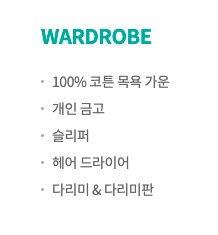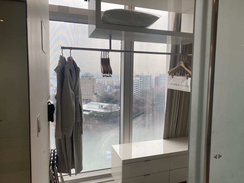 문을 열자마자 오른쪽에는 드레스룸이 있어 옷을 걸고 두는 게 가능했고, 이미 가운이 2개 있었다. 우린 처음부터 3명 예약한 것이라 세개 있을 줄 알았지만 전혀 아니었고, 가운은 수영하러 갈 때 입어야 했기 때문에 룸서비스를 통해 추가로 전달부탁드렸다. 나중에 수영하고 난 뒤 수영복을 저기 두고 말렸다.
