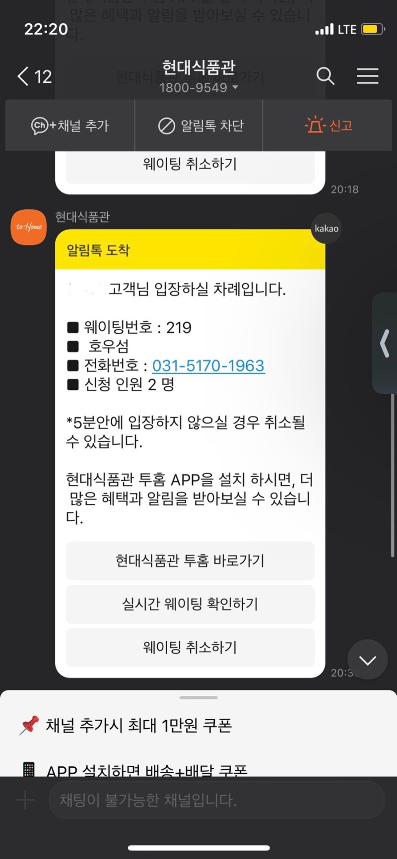 대기 신청 완료 알람으로 오인하고