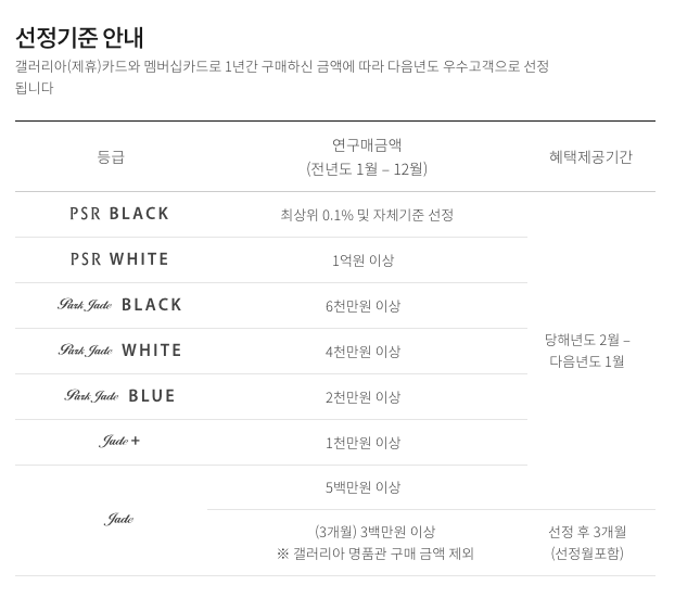 갤러리아 VIP 선정 기준은 아래와 같다.