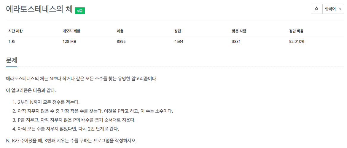 이미 알고리즘은 주어져있으므로 크게 생각할 부분은 없지만 array를 생성할때 2~N까지의 수를 집어넣는 것이므로 index에 주의해주어야한다. 1) N의 크기의 array를 생성해 0과 1번째는 사용하지 않는 방법과 2) N-2크기의 array를 생성하되 array에 저장하는 값을 2~N으로하는 방법도 존재하지만, 나는 boolean array를 이용하여 코드를 작성하였다. boolean은 int에 비해 현저하게 작은 메모리를 사용한다는 데에 장점이 있지만, index를 하는 데에 헷갈린다는 단점이 있다.