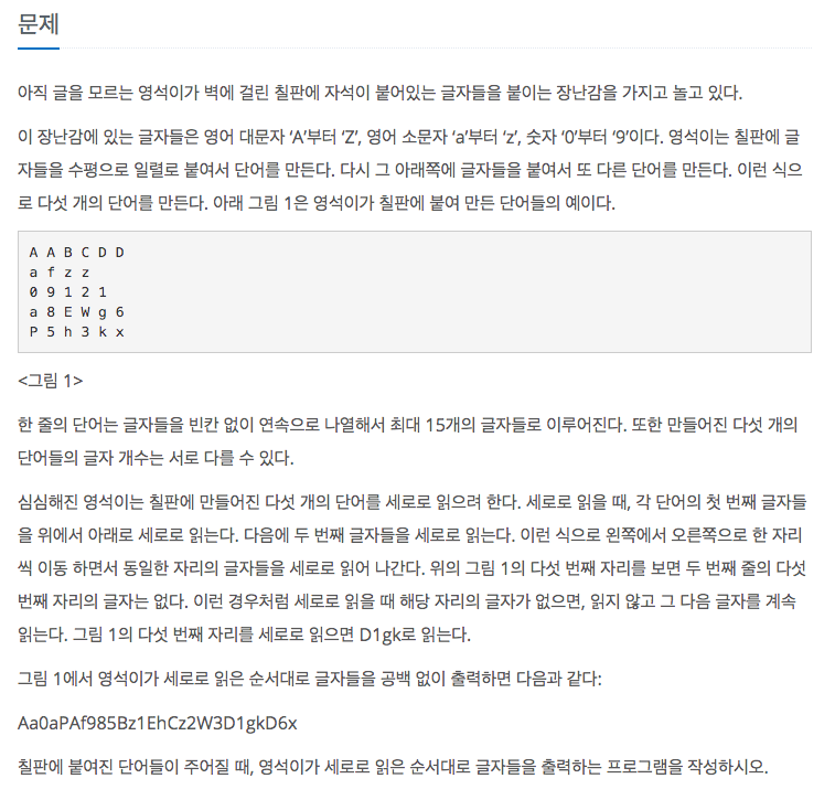 문제가 길게 나와있을 뿐, 중점은 5줄이 주어졌을 때 세로로 읽어서 결과를 출력하면 된다.