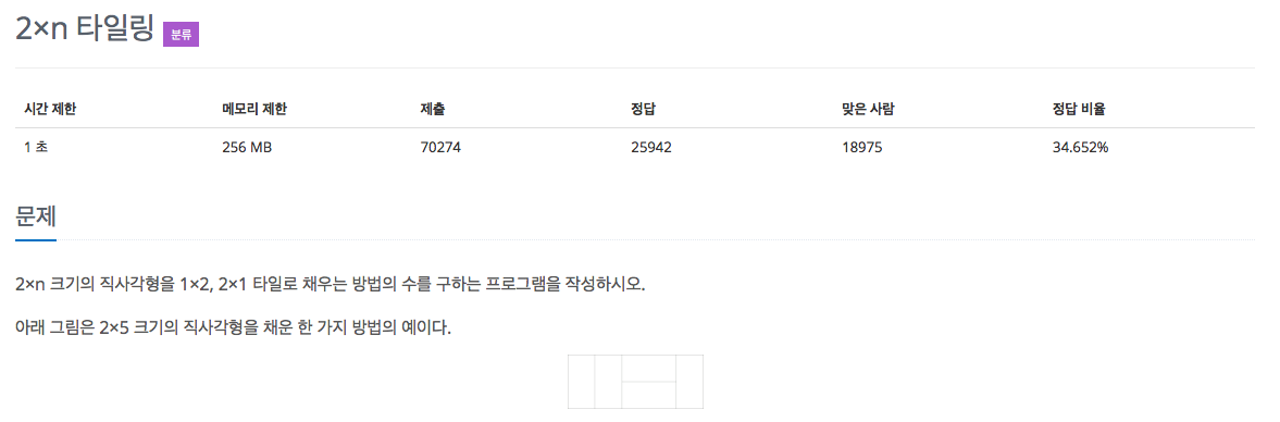 가로 크기가 n인 곳을 채워야 할 때, 처음 타일을 세워서 놓는 경우 가로의 크기가 (n-1) 인 곳을 채우는 문제가 되고, 반대로 눞혀서 놓을 땐 (n-2) 곳을 채워야하는 문제가 된다. 이를 이용하여 점화식을 세우면 D[i] = D[i - 1] + D[i -2]가 되고 해당 문제를 푸는 방식은 재귀함수를 이용하거나 동적 계획법을 이용하면 풀 수 있다. 하지만, 실험해본 결과 재귀함수를 이용하여 제출하면 시간 초과의 결과가 나온다. 재귀함수를 이용하더라도 메모제이션을 사용한다면 통과할 수 있을 것 같긴하다!