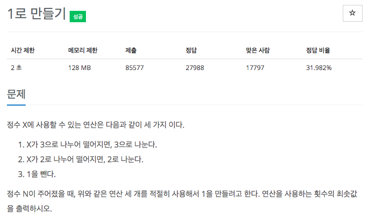 세 값 중 N을 3으로 나눈 값이 최소값이면 N은 이에 3을 곱해야하므로 연산이 하나 추가되게 된다. 즉, N에 관한 연산 최소값은 반대로 이들 중 최소값에 1을 더한 값이 된다. 구현된 재귀함수의 경우 이를 N에서 부터 top-down방식으로 구하는 것이고, 반대로 다이나믹 프로그래밍은 bottom-up방식으로 1부터 최소값을 구해나가며 최종 N값을 구하는 것이다.